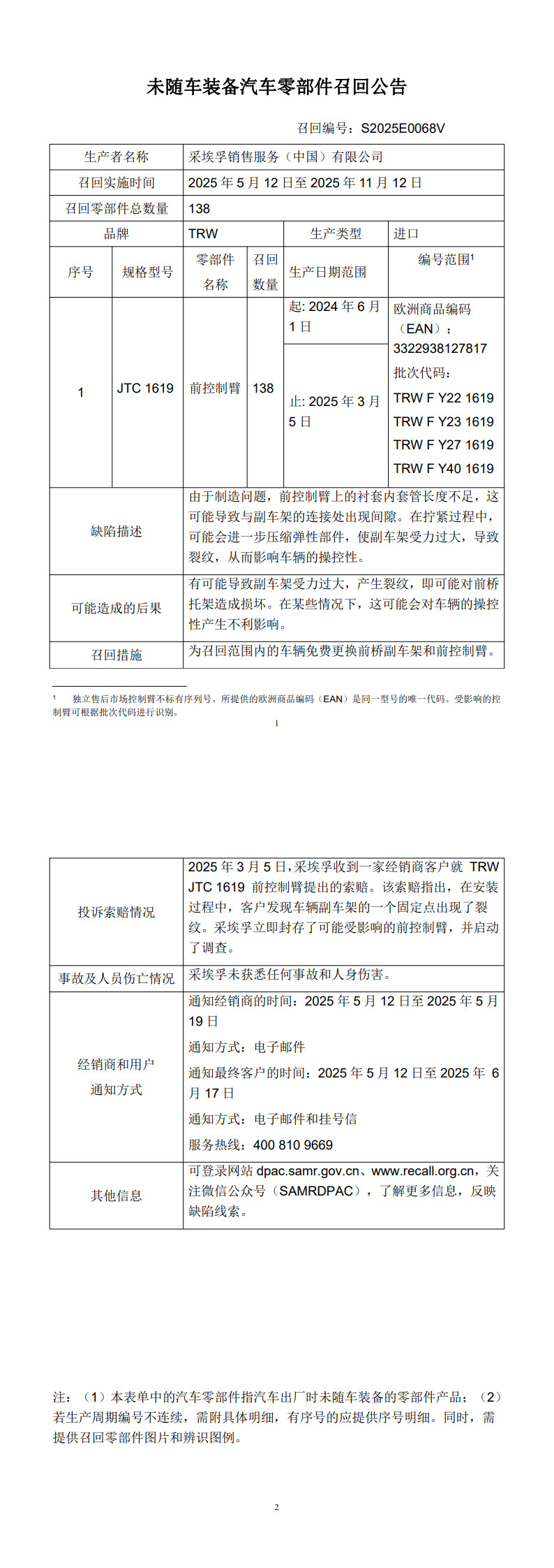 采埃孚销售服务(中国)有限公司召回部分进口前控制臂