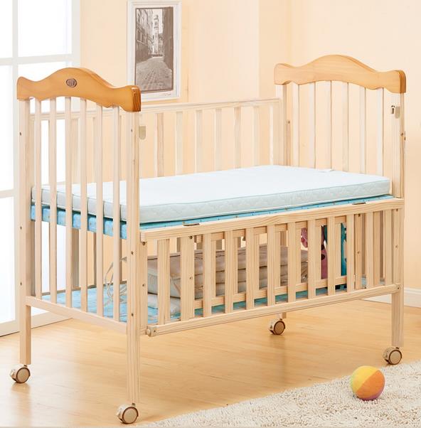 该产品为清水色、以新西兰松木为主材制作的婴儿床,具有单侧床头可加长及侧护栏可以翻转的功能。