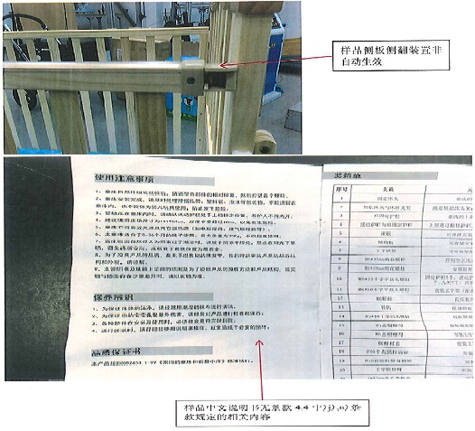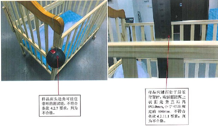 1、床头边角有可挂住带环测试链的凸出物;2、床铺面处于最低位置时,床铺面距离护栏上表面处垂直距离小于标准要求的600mm;3、儿童侧板侧翻装置非自动生效;4、产品说明书中缺少“当儿童可从围栏和类似用途童床爬出或达到一定身高时,应停止使用该产品”以及“若围栏和类似用途童床任何部分损坏、撕裂或丢失,不得使用该围栏和类似用途童床”的警告提示语。
