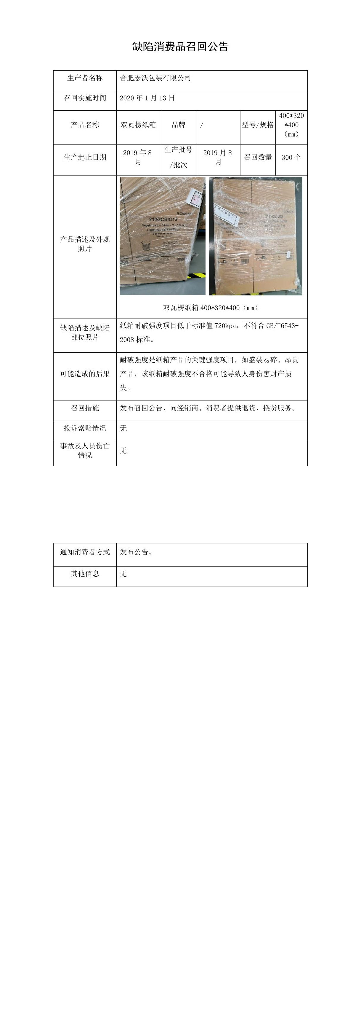 合肥宏沃包装有限公司召回部分双瓦楞纸箱