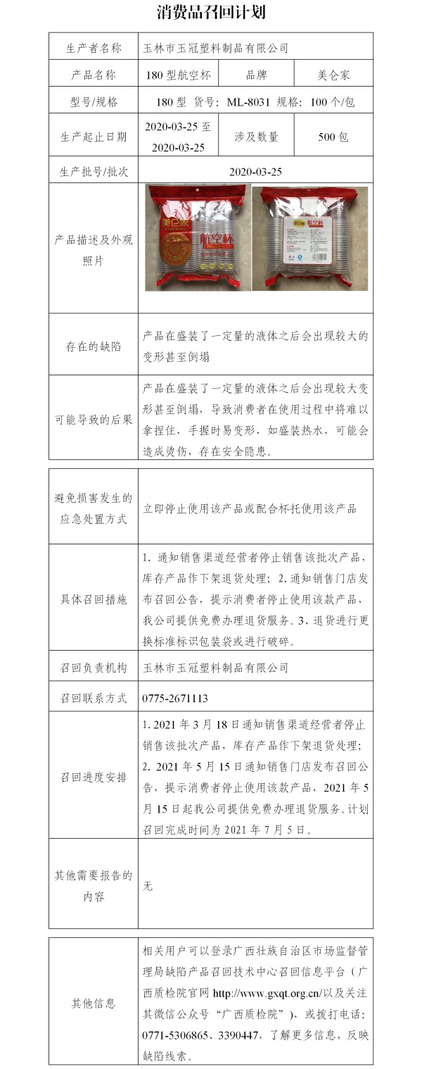 玉林市玉冠塑料制品有限公司召回部分美仑家180型航空杯