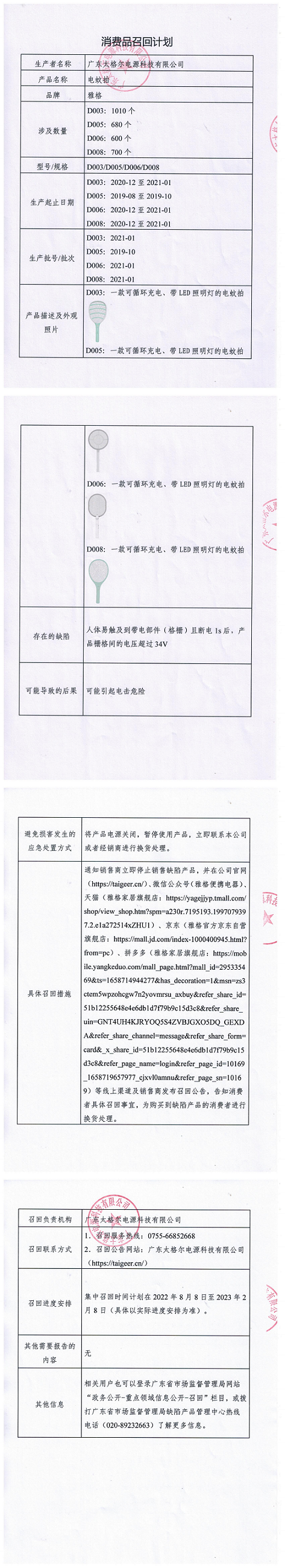 广东太格尔电源科技有限公司召回部分雅格牌电蚊拍产品
