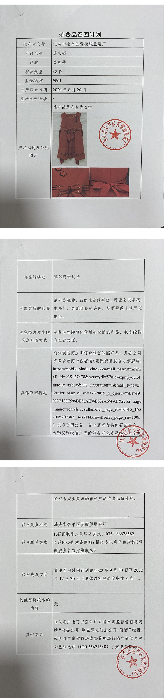 汕头市金平区萱微妮服装厂召回部分英美朵品牌连衣裙