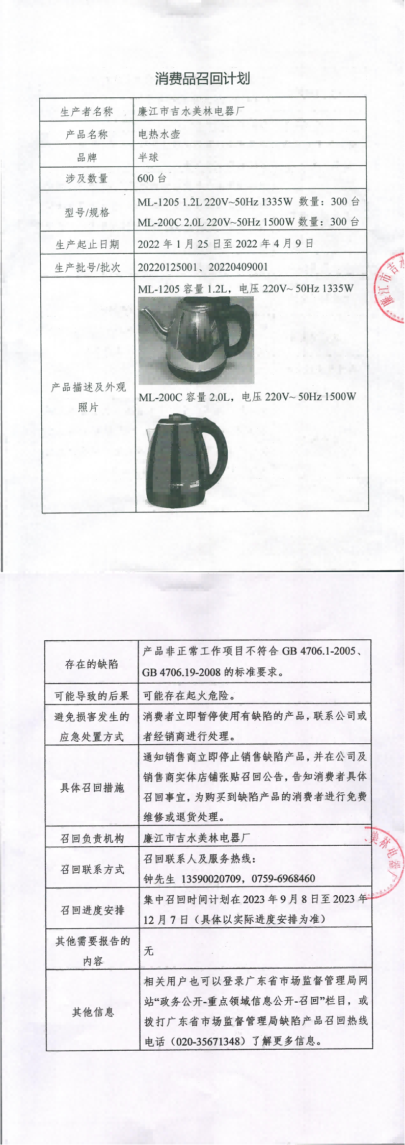 廉江市吉水美林电器厂召回部分半球牌电热水壶