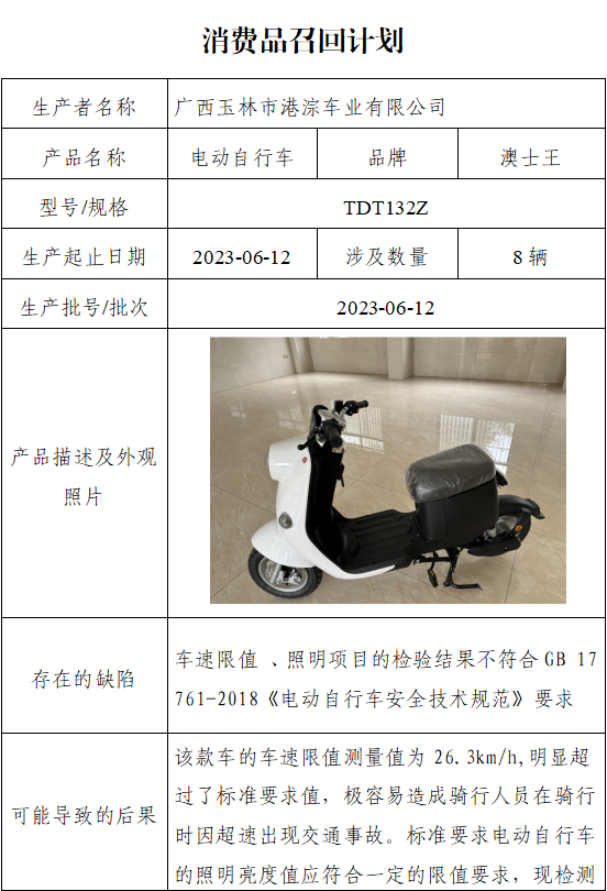 玉林市港淙车业有限公司召回部分澳士王电动自行车