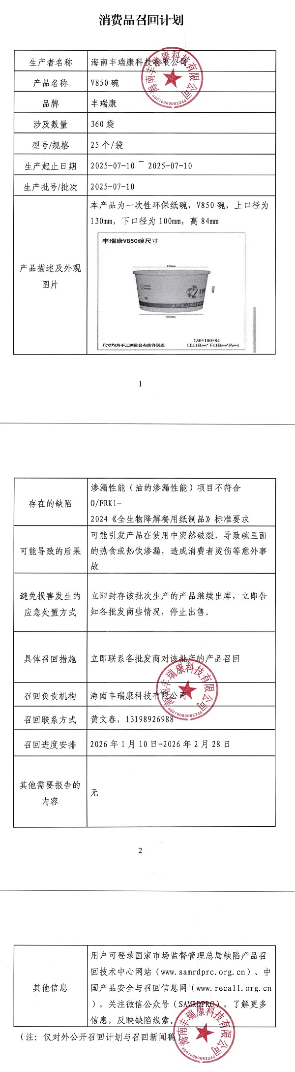 海南丰瑞康科技有限公司召回V850纸碗(食品用)产品