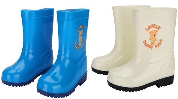 儿童雨靴为PVC材质,颜色:蓝色、白色。