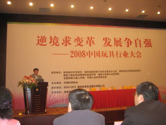 由中国玩具协会主办的2008年全国玩具行业大会于10月8日在上海召开,会议主题为:“逆境求变革,发展争自强”,300多家玩具生产商、销售商、检测机构、国外采购商参加本次盛会。商务部、国家质检总局、国家认监委、国资委和中国轻工业联合会的有关领导出席大会。