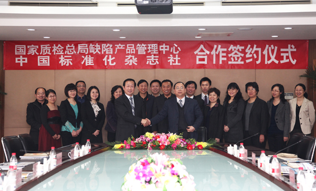 2012年2月20日,国家质检总局缺陷产品管理中心(以下简称“中心”)与中国标准化杂志社(以下简称“杂志社”)就合作创办《产品安全与召回》杂志签约仪式在中国标准化研究院(以下简称“中标院”)成功举行。王忠敏院长作为杂志社出品人、陈飞书记作为中心主任、马林聪副院长作为杂志社社长出席会议,参会者除了来自签约双方代表外,还邀请了中标院办公室、人事处、财务处和科研处的负责人参加了会议。会议由马林聪副院长主持。
