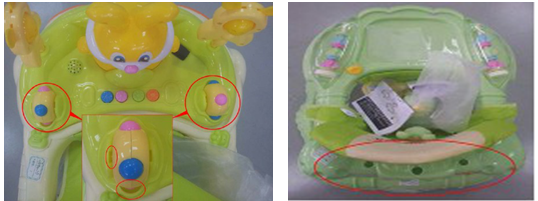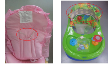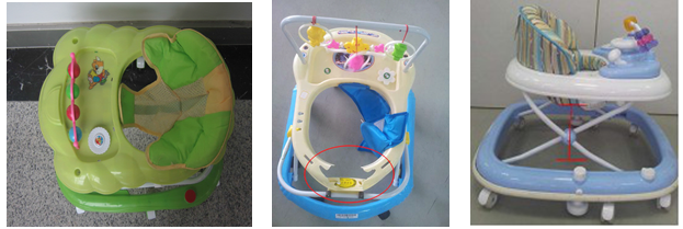 3.保护圈检查:侧面观察一下婴儿学步车的上保护圈应明显比底圈要小一些,以避免学步车在运动时婴儿的头部或手指直接与墙壁等刚性体碰撞接触造成伤害的危险。。用手对座位试着压一压,观察婴儿学步车是否有足够刚性和框架强度,以免因学步车强度不足,婴儿乘坐时可能发生结构断裂、车体坍塌造成跌伤、压伤或划伤等伤害危险。学步车的座兜高度应合适,其底部距离地面的高度应大于160mm,以保证在使用中儿童的脚部及关节不会因为腿部长时间的弯曲而导致损伤。